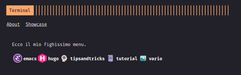 In questo post mostrerò un esempio base di come realizzare un menu “carino” usando le categorie come indice e abbinandogli delle icone, io userò le categorie ma si può usare qualsiasi tassonomia che si vuole, anche quelle custom. Questo progetto nasce da un’esigneza di un amico, k0BrA3390, e prendendo spunto dal sito di Leonardo Tamiano. Non sarà troppo complicato e con un po di basi di HUGO non si dovrebbero incontrare particolari difficolta nel personalizzarselo poi.